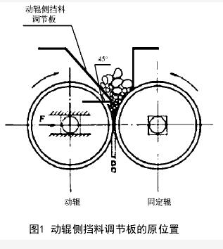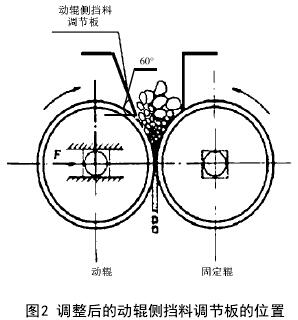 物料通过辊压机上部入料溜子进入辊压机的动定辊之间,由动辊侧的挡料调节板来调节进入两辊间的物料量 ,如图1。经过观察 ,动辊侧挡料调节板伸向固定辊,造成下料点偏向于固定辊 ,致使固定辊侧上部物料多 ,而活动辊侧上部几乎没有物料 ,物料在两辊之间分布不均匀 ,造成辊压机的两侧压力不稳定,结果是通过辊压机的物料没有被充分碾压,出料粒度大。