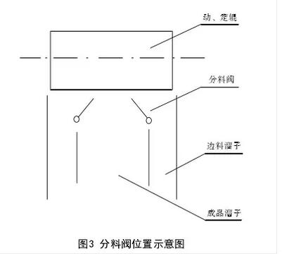 经过辊压机动、定辊碾压的物料形成料饼 ,在两辊间的下部出来 ,由于两辊间进料充分,物料被碾压的效果好,边部的物料碾压效果不及中部物料,分料阀的作用是将碾压效果好与不好的物料进行分离(图3)。由于一直认为分料阀开度越小越好,故一度将分料阀开度调整到20% ,结果成品中一直含有10 mm左右的粗物料。打开辊压机侧门观察 ,发现边料溜子物料多且下不及,物料堆积到分料阀转轴附近 ,从分料阀的转轴下部串入成品溜子 。