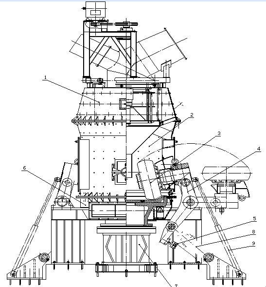 (7)    磨盘周边上设有防止盘座磨损、调节风环处风速和盘上物料厚度的装置 ,可确保立式磨的生产能力及其经济运行。