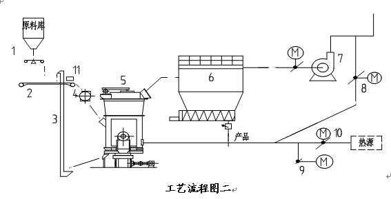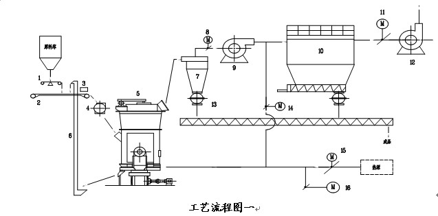 1.电子皮带称 2.皮带输送机  3.板链提升机  4.回转锁风喂料机  5.HRM型立式磨 6.气箱脉冲收尘器 7.立磨排风机 8. 循环风碟阀  9.冷风蝶阀  10.热风蝶阀  11.电动除铁器