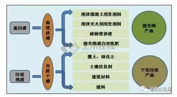 污泥经水解处理后,其含蛋白液体经浓缩后可作为蛋白发泡剂和有机肥等利用,污泥残渣可用做覆土、绿化土、土壤改良剂和建筑材料等。